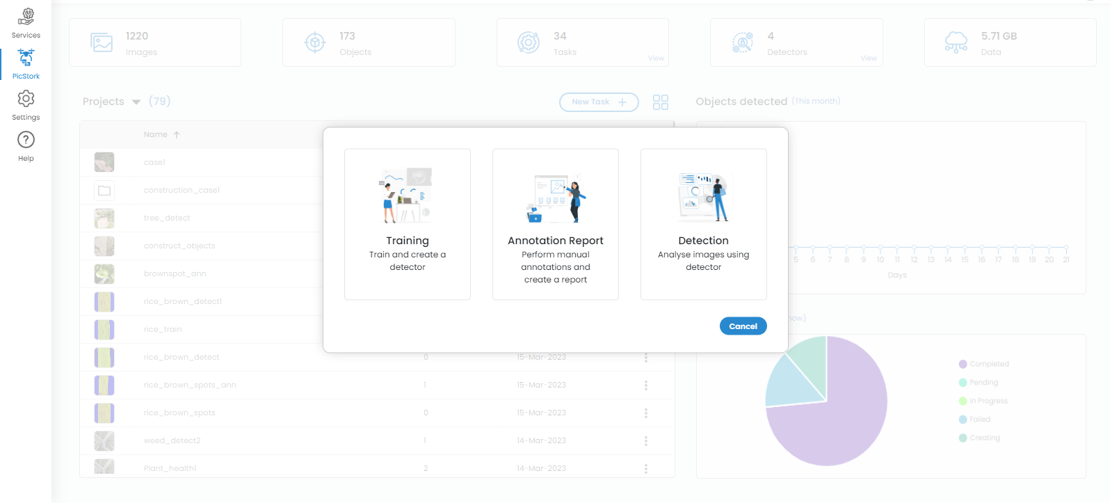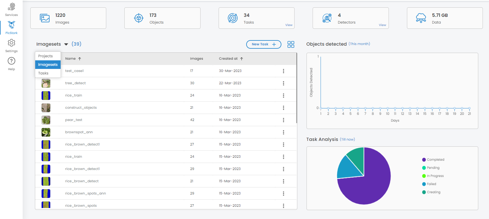 The dashboard provides statistics related to the objects detected, projects handled, etc. as shown in the following image.