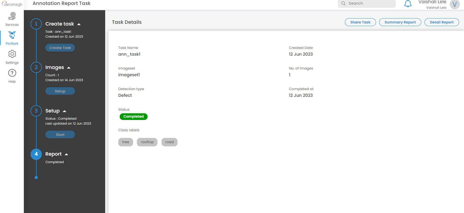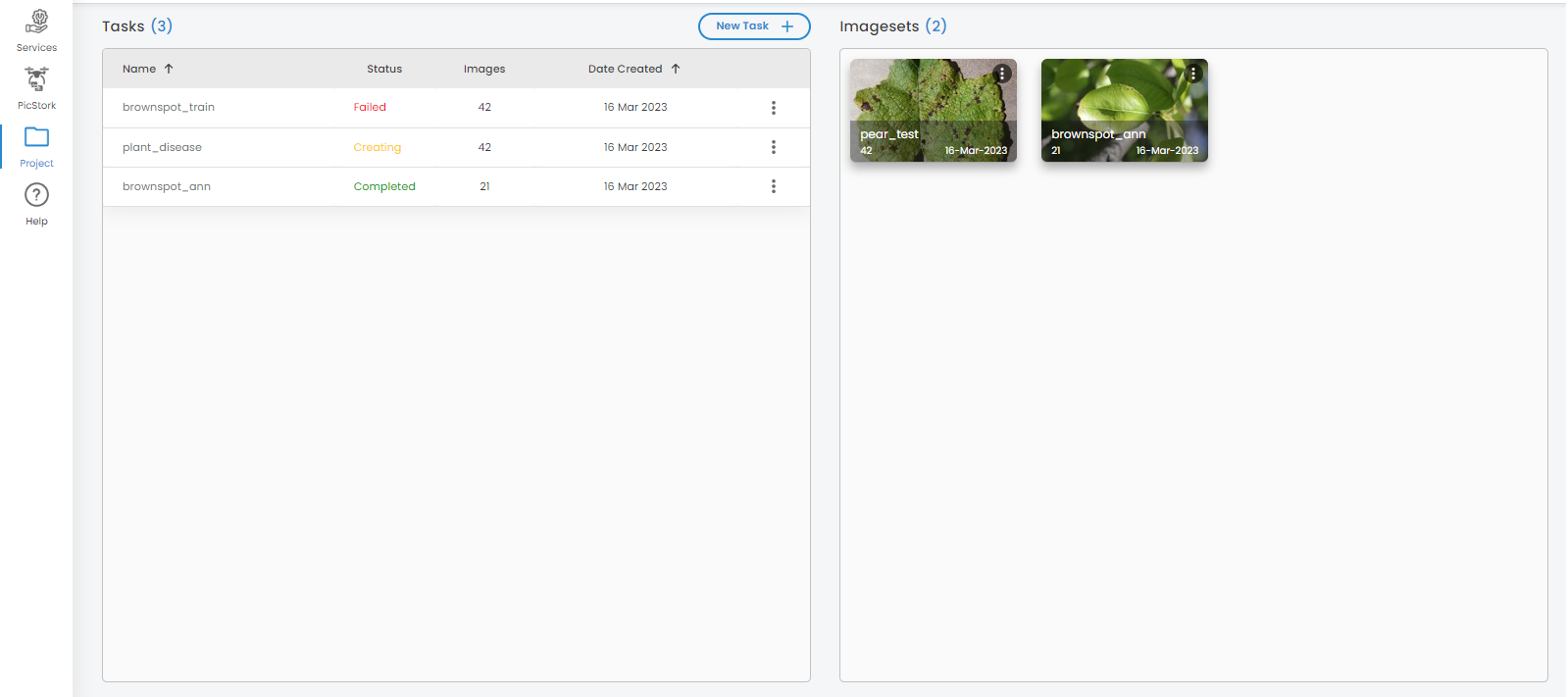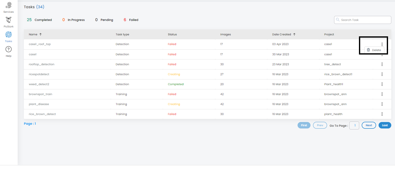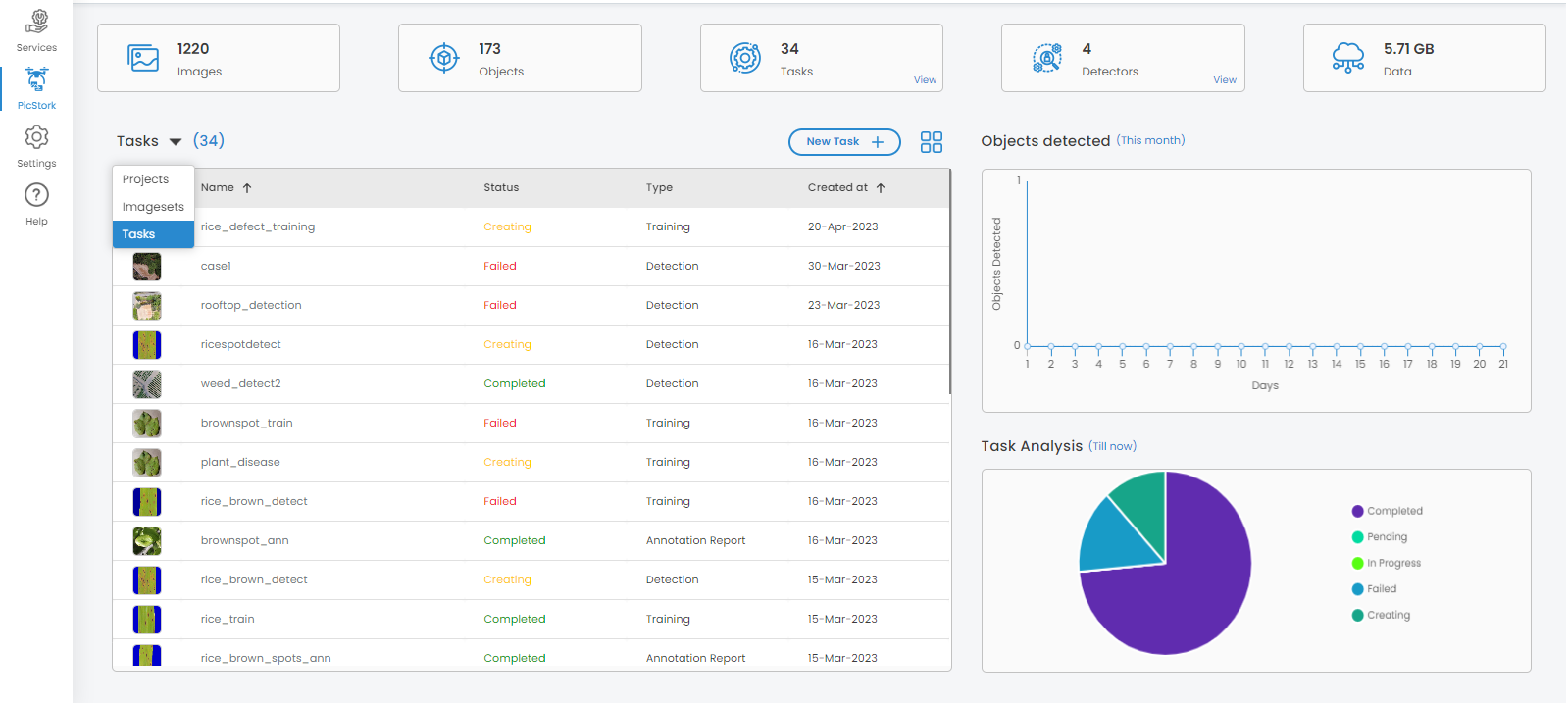 The list of tasks associated with the selected project will be displayed along with the details such as the name of a task, status, number of images used, and date of task created.